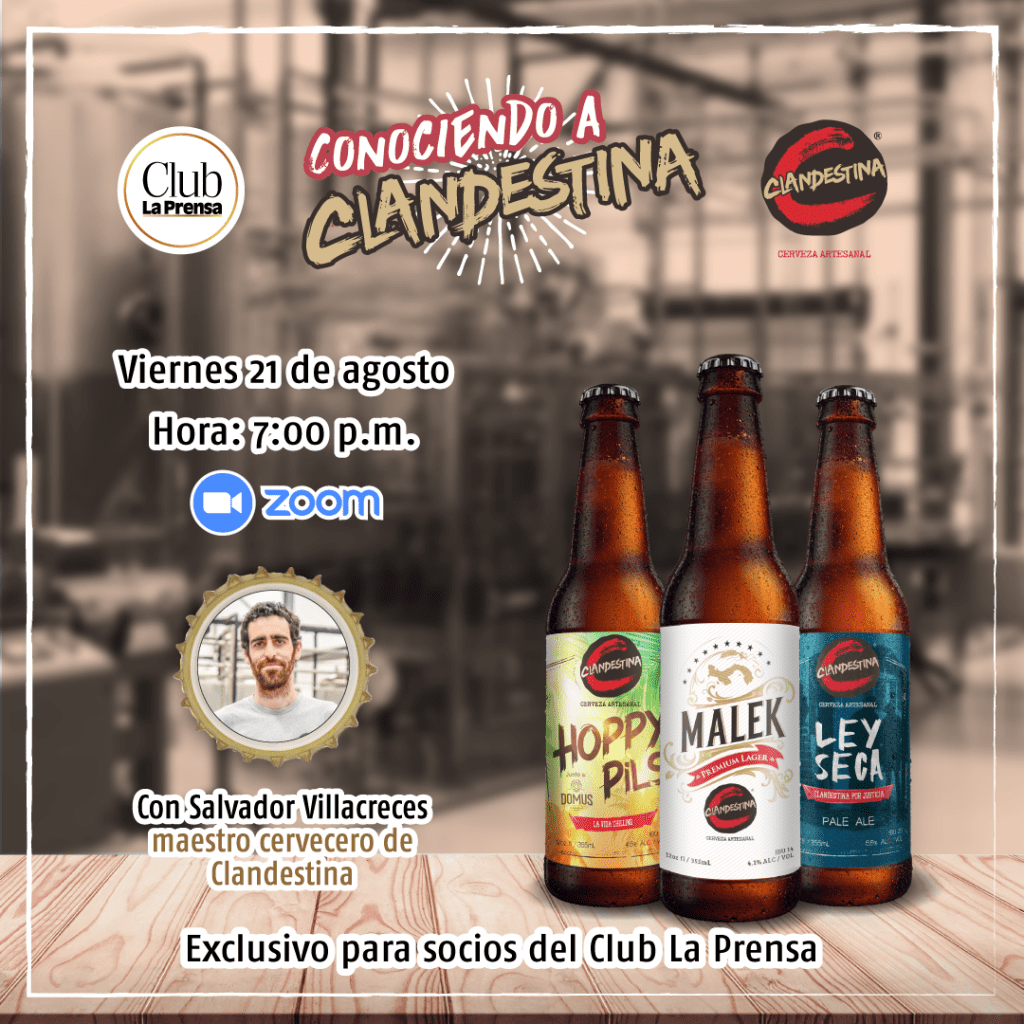 ¿Qué tanto conoces de las cervezas de Clandestina? Si disfrutas de las cervezas artesanales, este evento es para ti. El viernes 21 de agosto te invitamos a una cata exclusiva y privada para socios del Club La Prensa, en la cual estaremos compartiendo con Salvador Villacreces, maestro cervecero de Clandestina, vía Zoom, a partir de las 7:00 p.m. Para asistir, debes escribir a club@prensa.com, incluyendo el número de socio para reservar tu cupo. ¡Cupos limitados!